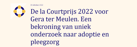 De Pieter de la Court prijs van de Koninklijke Nederlandse Akademie van Wetenschappen is in 2022 uitgereikt aan Gera ter Meulen van KennisBureau ter Meulen. De prijs werd uitgereikt voor het toegankelijk maken van wetenschappelijke kennis rond pleegzorg en adoptie. Deze blog vertelt waarom de jury de prijs aan haar toewees. The 2022 Pieter de la Court Prize of the Royal Academy of Arts and Sciences has been awarded to Gera ter Meulen of Knowledge Bureau ter Meulen for her making scientific knowledge around foster care and adoption accessible. The blog shows why the jury awarded the prize to Gera ter Meulen. www.kbtermeulen.nl